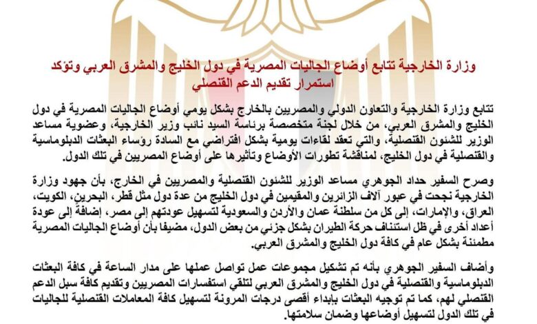 الخارجية تتابع أوضاع الجاليات المصرية في دول الخليج والمشرق العربي وتؤكد استمرار الدعم القنصلي