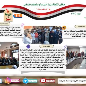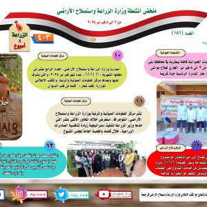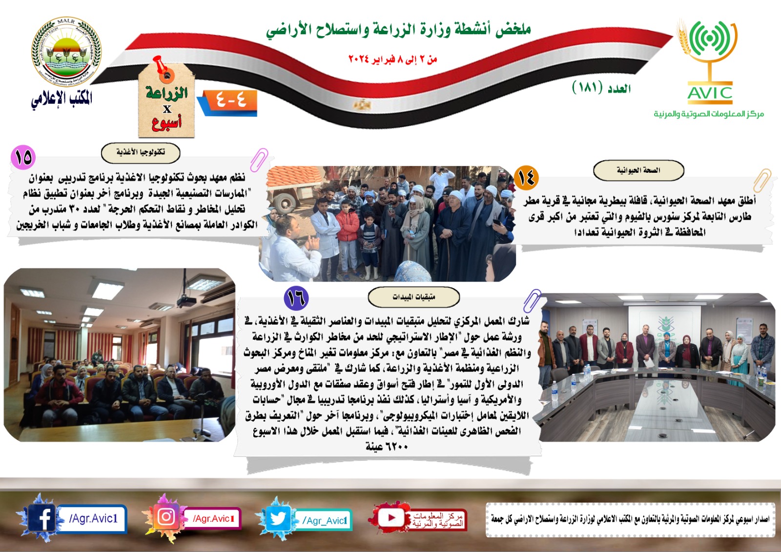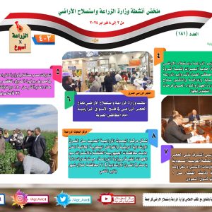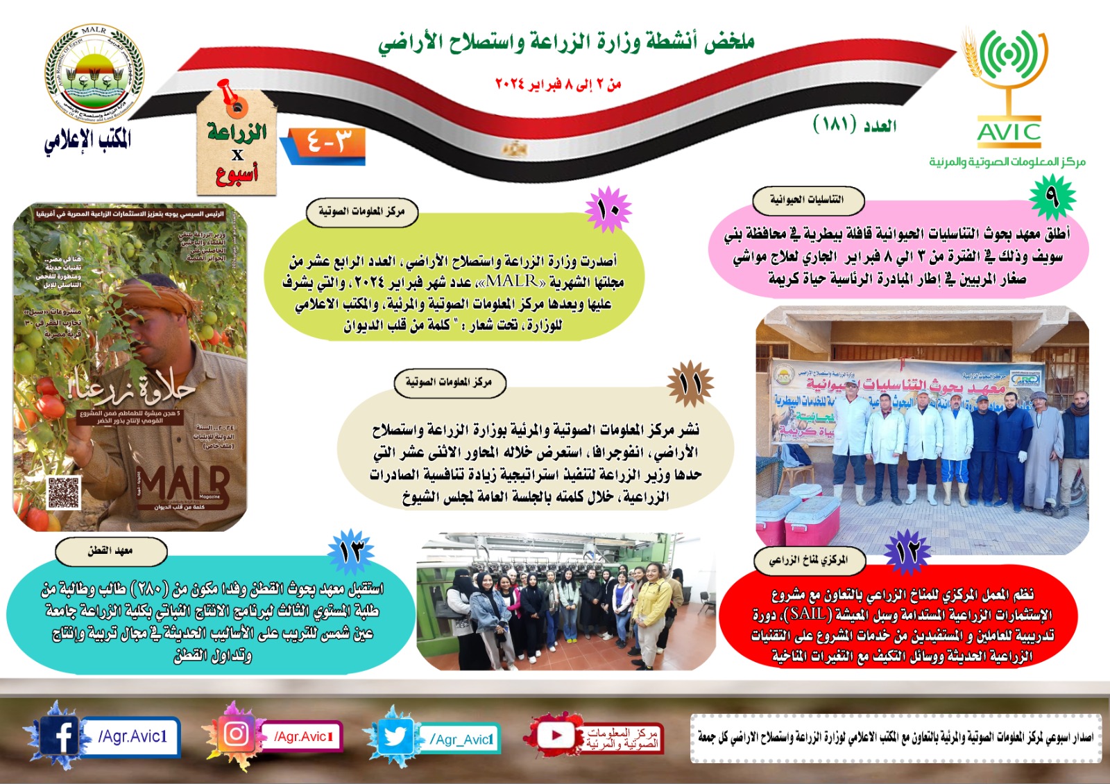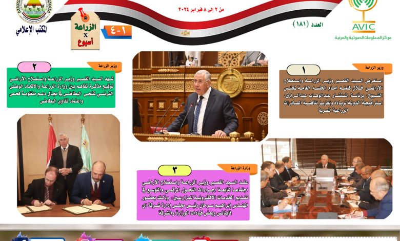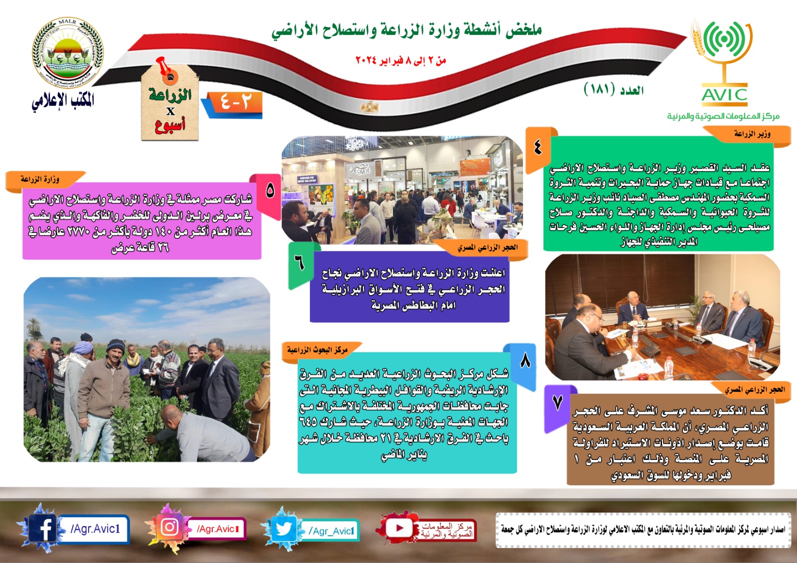 أصدر مركز المعلومات الصوتية والمرئية، التابع لوزارة الزراعة واستصلاح الاراضي، “الانفوجراف الاسبوعي” في نسخته رقم ١٨١ ، حول الحصاد الاسبوعي لأهم أنشطة الوزارة، خلال الاسبوع الماضي في الفترة من ٢ الى ٨ فبراير الجاري، وذلك بالتعاون مع المكتب الاعلامي للوزارة، كما أصدر المركز ايضا ملخصا بالفيديو، حول انشطة الوزارة خلال نفس الفترة.