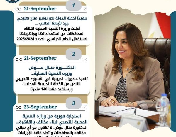 أعلنت الدكتورة منال عوض وزيرة التنمية المحلية، عن اتمام جميع المحافظات استعدادات وجاهزية المدارس لاستقبال العام الدراسي الجديد 2024/2025 علي مستوي جميع المحافظات، والذي انطلق يوم السبت الموافق 21 سبتمبر 2024، لبعض المراحل الدراسية والانتهاء من اجراءات استلام المدارس الجديدة، وتوفير المرافق الحيوية بها، والانتهاء أيضاً من إجراءات تطوير المدارس التي شهدت عمليات ترميم واحلال وتجديد قبل بداية العام الدراسي، واجراء الصيانة اللازمة لباقي المدارس بما يتفق مع المعايير الصحية حفاظًا على صحة التلاميذ من الأمراض، وذلك في ضوء توجهات الدولة نحو توفير مناخ تعليمي جيد لأبنائنا الطلاب.