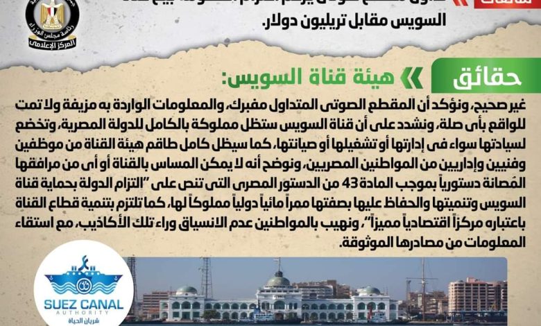 وقام المركز الإعلامي لمجلس الوزراء بالتواصل مع هيئة قناة السويس، والتي نفت تلك الأنباء، مُؤكدةً أنه لا صحة لاعتزام الحكومة بيع قناة السويس مقابل تريليون دولار، وأن المقطع الصوتي المتداول مفبرك، والمعلومات الواردة به مزيفة ولا تمت للواقع بأي صلة، مُشددةً على أن قناة السويس ستظل مملوكة بالكامل للدولة المصرية، وتخضع لسيادتها سواء في إدارتها أو تشغيلها أو صيانتها، كما سيظل كامل طاقم هيئة القناة من موظفين وفنيين وإداريين من المواطنين المصريين.