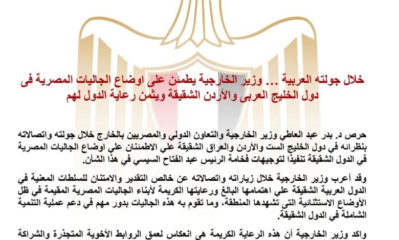 حرص الدكتور بدر عبد العاطي، وزير الخارجية والهجرة وشؤون المصريين بالخارج، خلال جولته العربية واتصالاته بنظرائه في دول الخليج العربي والأردن والعراق، على الاطمئنان على أوضاع الجاليات المصرية المقيمة بتلك الدول، تنفيذًا لتوجيهات الرئيس عبد الفتاح السيسي.